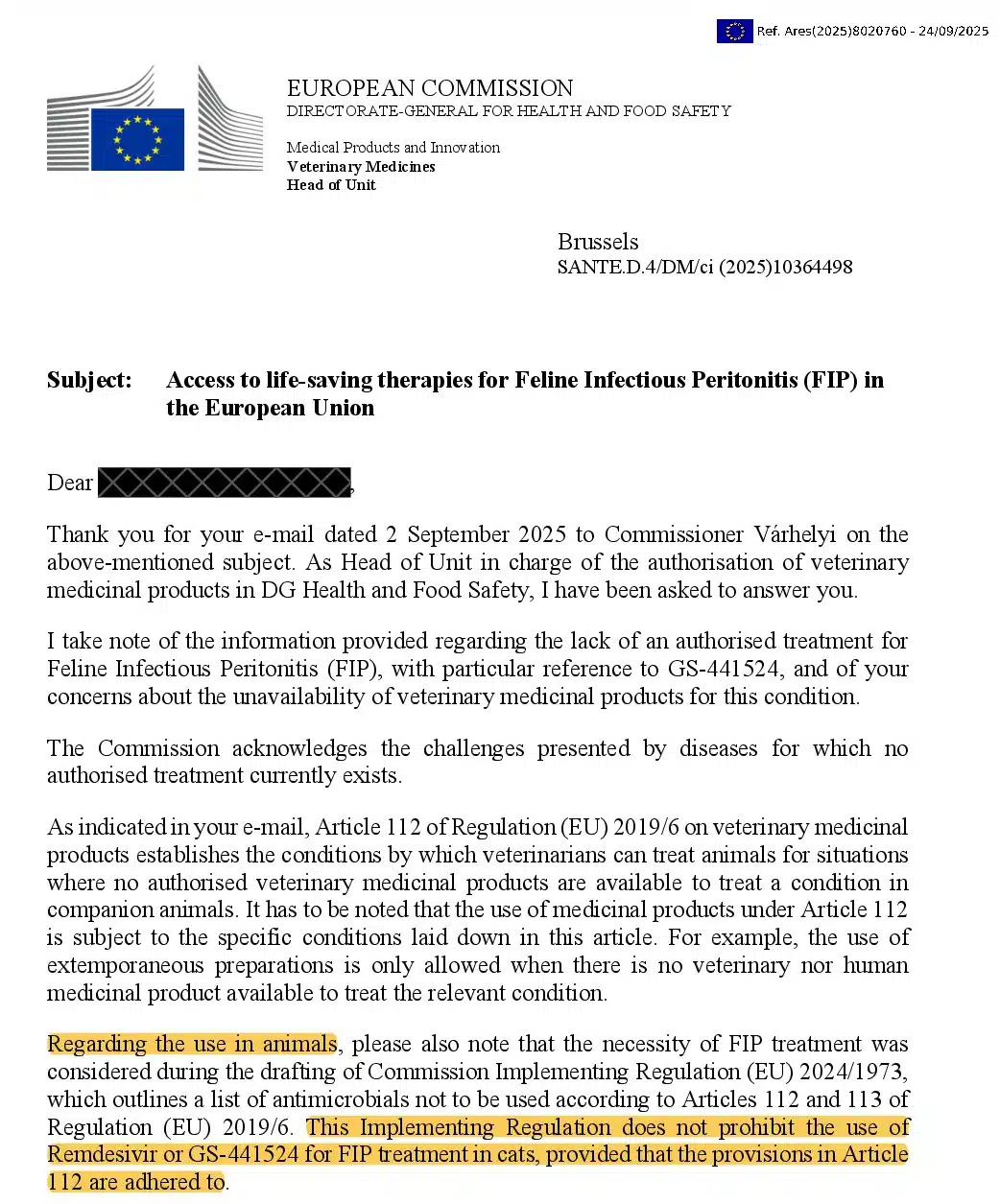 Aggiornamento 2: in data 23/10/25 il sottosegretario alla Salute Gemmato firma un’altra circolare in cui RICONOSCE LA PERFETTA LEGALITA’ DEL GS-441524 come farmaco galenico in Italia.